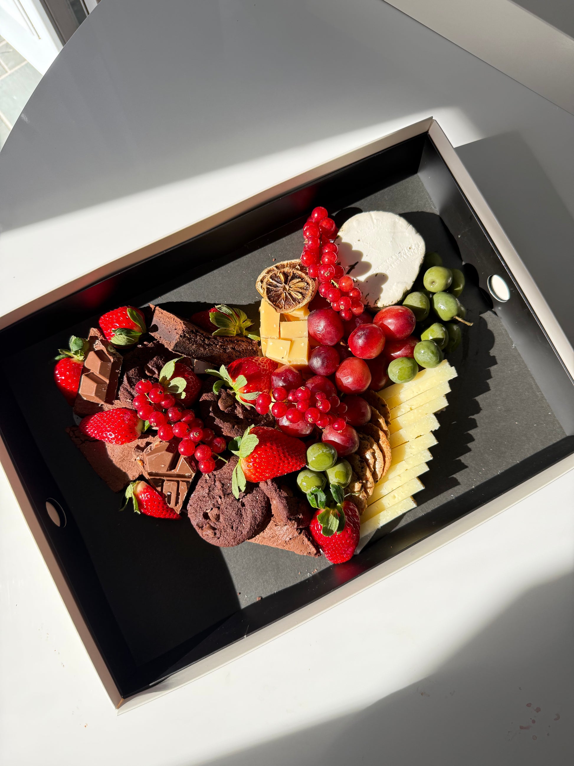 Featuring Tony’s Chocolonely chocolate bars, fudgy brownies, and double chocolate cookies paired with Manchego, truffle Gouda, and herbed goat cheese. Finished with fresh strawberries, grapes, red currants, green olives, artisan crackers, and dried citrus for a beautiful balance of flavors and textures.
